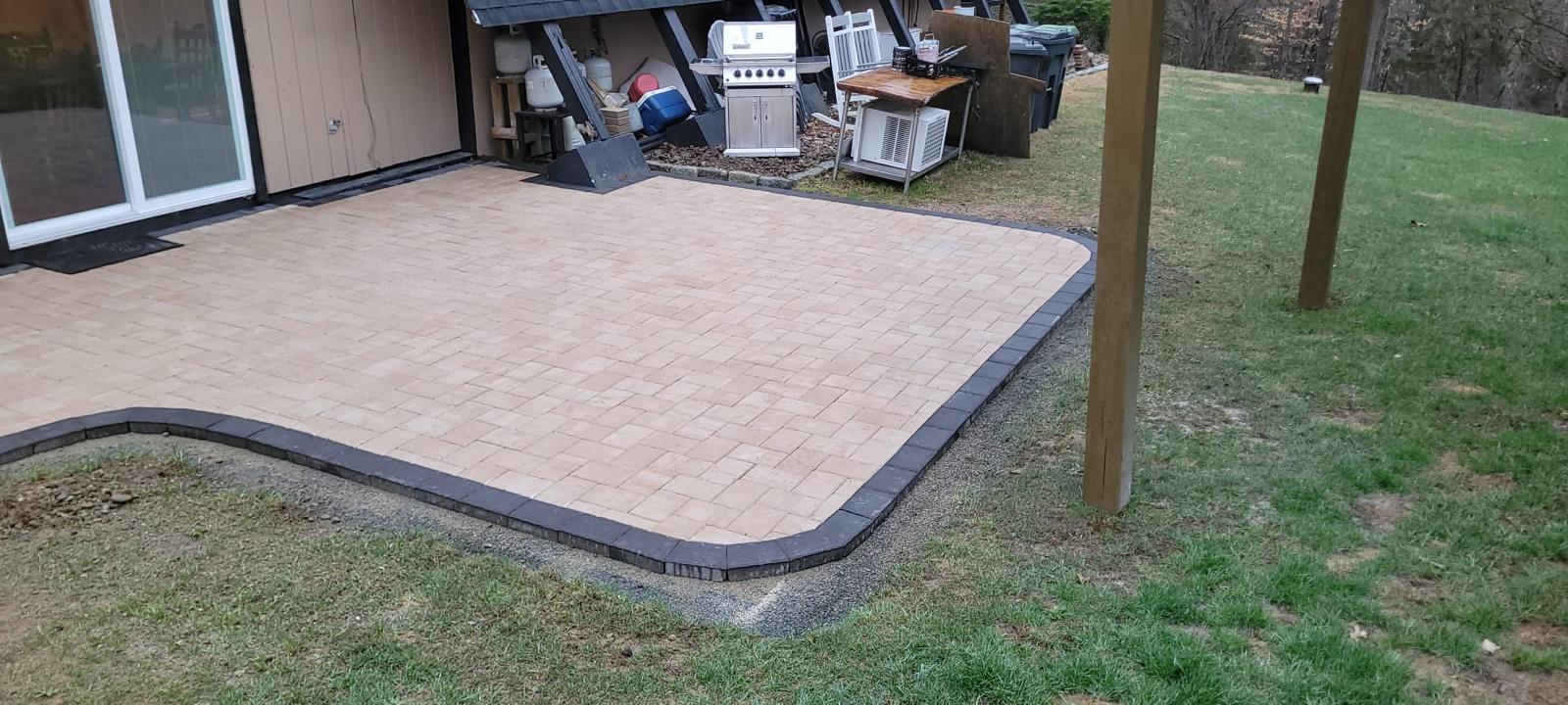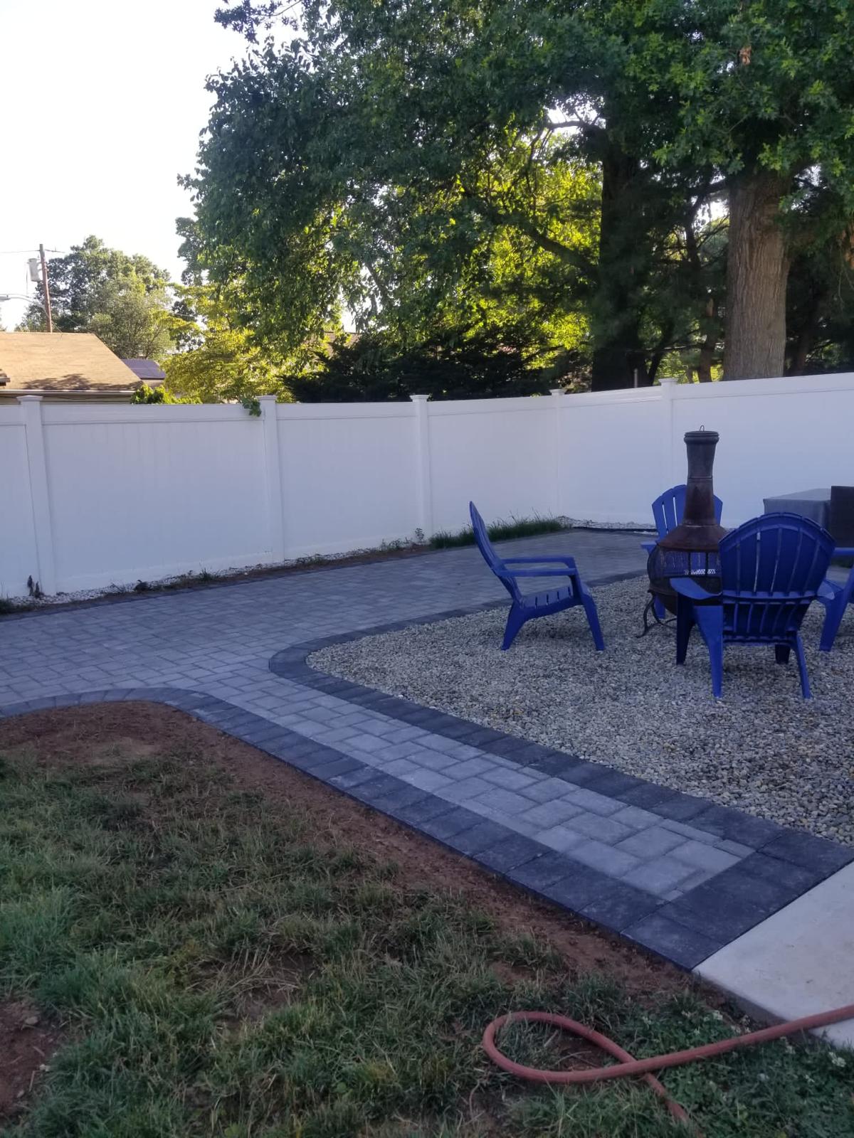 This hardscaping project features a clean, custom paver patio with defined borders and a gravel fire-pit area, creating a durable and inviting outdoor space built for both relaxation and long-term use.